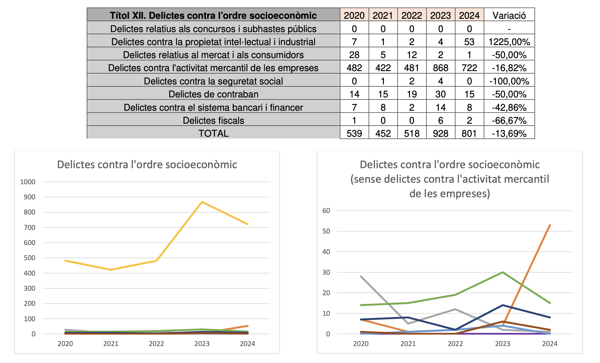 Ara per ara no es tractava d’infraccions o delictes gaire comesos al Principat. De fet, els darrers anys en cap cas s’havia arribat a la desena de delictes registrats. El 2020 hi va haver set delictes d’aquesta tipologia. Però és que els anys posteriors, tot just van ser un i dos. Res, doncs, de rellevant. I continua sent una activitat delictiva minsa. Però que agafa volada. De fet, dins de l’ordre socioeconòmic se situa en segon lloc, a moltíssima distància del delicte rei en aquest capítol, que són els delictes contra l’activitat mercantil de les empreses. Però superant, per exemple, els delictes de contraban.