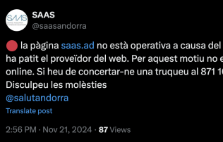 També s’han vist afectades les pàgines d’Andorra Business, Andorra Digital i Andorra Recerca + Innovació, ja que totes utilitzen el servidor que ha caigut. En el seu cas, la incidència els ha afectat “relativament poc”, perquè avui no tenien cap compareixença ni cap comunicat. “Si haguéssim hagut d’actualitzar continguts sí que ens hauria afectat més”, expliquen. Això si tot i que en l'àmbit intern no els ha afectat, externament han contactat amb ells algunes persones preguntant per què no funcionava.