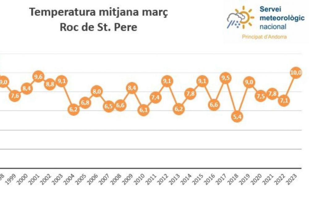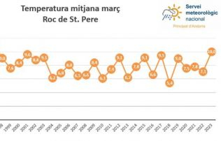 El mes de març que acabem de tancar ha tornat a posar de relleu que estem tenint temperatures per sobre del normal per l’època de l’any. Així ho demostren les dades recollides a l’estació meteorològica del Roc de Sant Pere. La temperatura mitjana ha estat de 10 graus, la tercera més elevada dels darrers trenta anys i 3,7 graus per sobre respecte el març del 2021. Ens hem de remuntar al 1994 i al 1997 on la temperatura mitjana del mateix mes va arribar als 11 graus.
