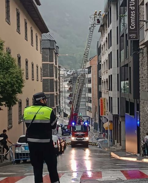 Una dotació dels bombers, amb el camió escala més gran, s’ha desplaçat aquest matí fins al carrer Josep Viladomat d’Escaldes per fer tasques de sanejament en una façana, just a l’edifici número 6, molt a prop ja de l’avinguda de les Escoles. L’actuació dels bombers i el fet d’haver de parar el camió al bell mig de la via han fet que com a mínim la part alta de l’esmentat carrer s’hagi hagut de tallar a la circulació.