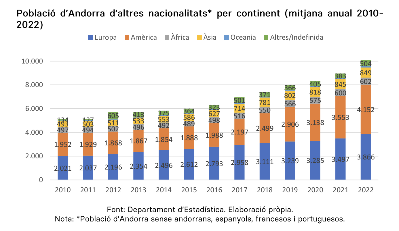 L’estudi de l’AR+I recull que el col·lectiu de residents d’altres nacionalitats ha passat de 5.140 persones el 2010 a 10.63 el 2022, el que suposa un increment de gairebé el 96%. Entre tots ells, la nacionalitat que més destaca és l’argentina, que ha més que doblat el nombre d’habitants respecte les dades del 2010, passant de 602 a 1.374 (+128,2%). Des de l’AR+I s’unta que la tendència a l’alça s’explica perquè “alguns treballadors temporers s’han establert a Andorra”. I és que precisament, els immigrants que arribaven al país de països llatinoamericans, com Argentina o Xile, eren habitualment temporers per a la temporada d’hivern.