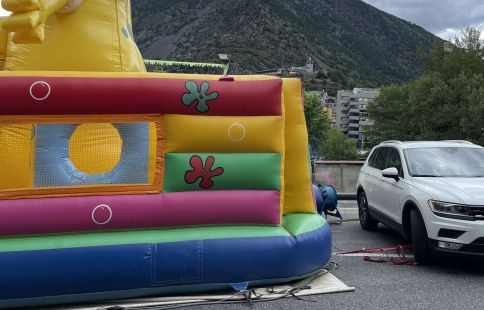 I és que el castell inflable, en aquest cas dedicat a Bob Esponja i un dels elements d’aquestes característiques de majors dimensions dels que hi ha a la festa, està subjectat directament en la roda, en la llanta, d’un vehicle. Encara que no ho sembli, i tot i que molt estètic no queda, a priori és un dels sistemes com a mínim tolerats per subjectar aquest tipus d’atraccions infantils. No obstant això és obvi que aquesta manera d’agafar l’inflable ha causat cert neguit en una part dels pares que han parat compte al sistema.