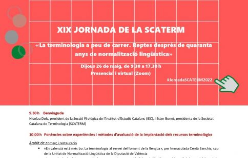 Per tal d’assolir aquests objectius, en la primera part de la XIX Jornada hi haurà la presentació d’experiències relacionades amb el comerç i la restauració, a càrrec d’Immaculada Cerdà (Unitat de Normalització Lingüística de la Diputació de València), Marta Pujol (Servei de Política Lingüística del Govern d’Andorra) i Alexandra Sans (Consorci per a la Normalització Lingüística), i de les relacionades amb els esports, a càrrec d’Anna Vila (Departament d’Assessorament Lingüístic de la Corporació Catalana de Mitjans Audiovisuals), Natàlia Fuster (Signewords-IB3) i Marc Ibern (Servei Lingüístic de la Unió de Federacions Esportives de Catalunya).