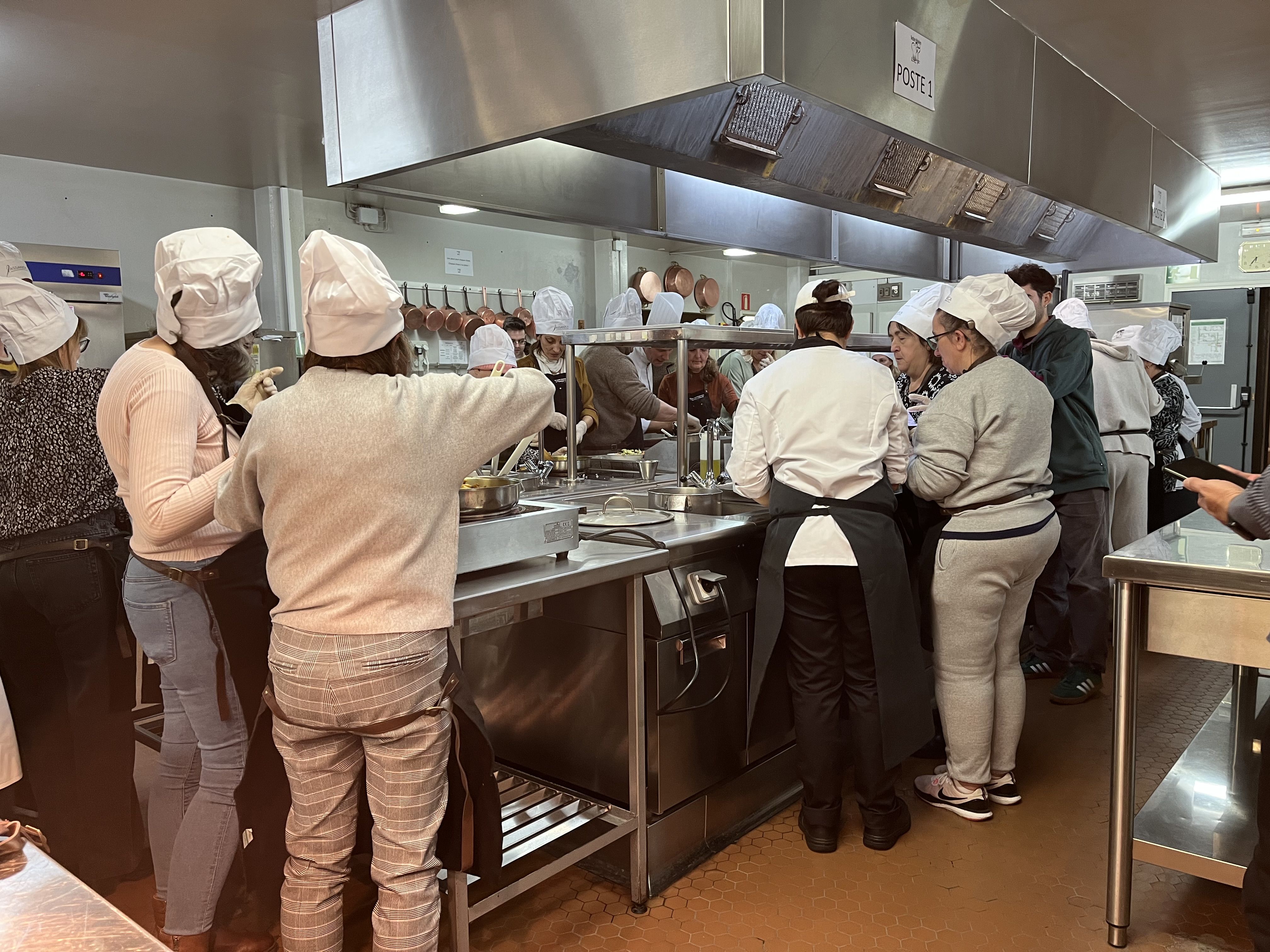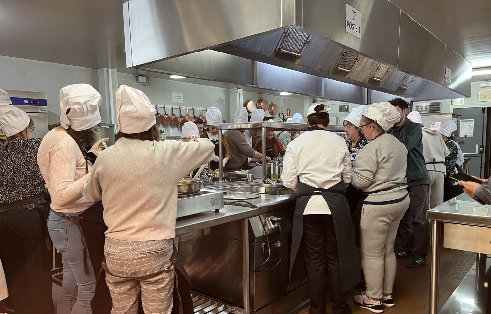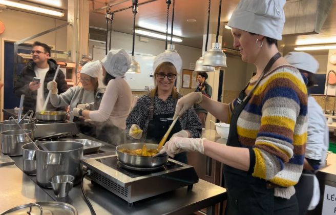 Tornant a l’acte, i ja havent intentat fer alguna cosa similar alguna edició passada amb uns microones, enguany una vintena de participants en l’activitat s’han posat sota les ordres del cuiner, Hugues Lemarignier, de la section hôtelière del Lycée Comte de Foix, que els ha ajudat en l’elaboració de dues receptes que s’han presentat posteriorment als assistents. Entre rialles, els membres i col·laboradors de l’associació preparaven els plats acompanyats també dels alumnes de restauració del Lycée. A continuació, ha estat el torn de la dietista i nutricionista Marta Pons, que ha donat una explicació del valor que té cada un dels plats durant la degustació. Saravia ha explicat que com enguany ho feien amb un espai més limitat, aquest any no hi ha hagut tanta gent, però si tot va bé i el Lycée els hi permet, de cara a l’any vinent miraran de fer dues jornades en lloc d’una per poder ampliar la quantitat de gent que treballi a la cuina.