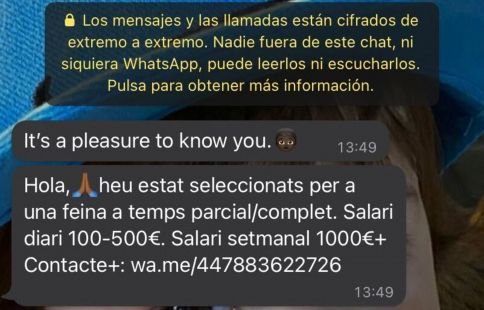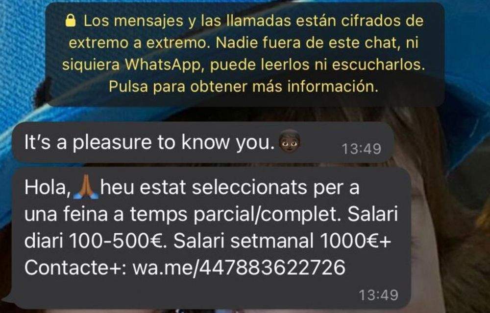 El missatge ve a dir que s’ha estat seleccionat per una feina que pot ser parcial o a temps complet i remunerada amb entre 100 i 500 diaris o un salari mensual d’aproximadament 1.000 euros. Cal anar en compte en no caure en la trampa i no voler fer el seguiment del contacte que inclou el missatge.