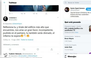 Pel que queda clar, això de no atacar missatger no s’ho aplica a ell. De fet, no s’ha acontentat amb l’atac al compte oficial d’Espot sinó que també s’ha embrancat en una intensa baralla a cop de piulada amb diferents usuaris que li han retret les seves formes. No ha dubtat en fer servir altres expressions injurioses tant de nou cap al cap de Govern com cap als altres tuitaires, com ara “imbècil” o “borrego” entre altres.