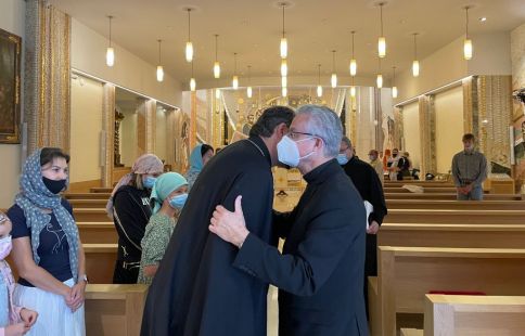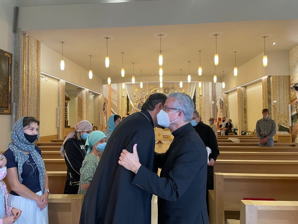 La comunitat ortodoxa resident a Andorra, celebra mensualment la Divina Litúrgia a l’església catòlica de Sant Julià, que sempre presta les seves instal·lacions perquè ho puguin fer. Vives ha aprofitat també per saludar alguns dels residents russos que han acudit a la cerimònia.