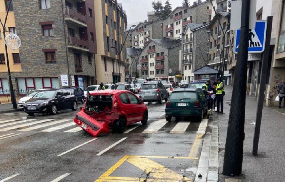 La calçada molla a causa de la pluja s'apunta com la causa principal de l'accident que ha tingut lloc en un pas de vianants i al costat d'una parada del clípol. Els dos turismes implicats tenen matrícula andorrana. Els agents comunals s'han ocupat de regular el trànsit alternatiu fins que s'ha retirat un dels vehicles implicats.