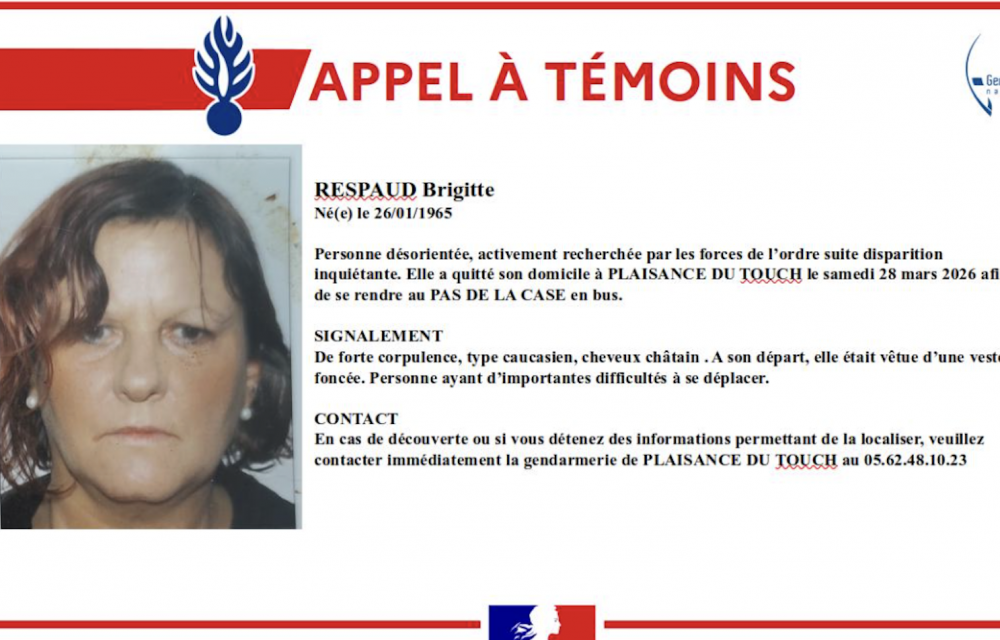 L’avís de l’absència sobtada situa Respaud en una zona àmplia, molt vasta: entre el Pas i Plaisance-du-Touch, una localitat propera a Tolosa i poble d’on és originària l’extraviada. La família, lògicament, ofereix dades sobre la desapareguda: mesura 1,70 metres d’alçada, és corpulenta (especialment en la zona abdominal), té els cabells de color castany clar (amb reflexos rossos) i la cabellera li acaba damunt de les espatlles. Duia, a més, un abric fosc.