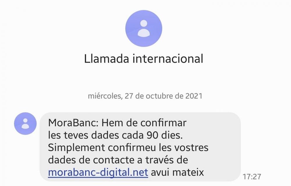 Són diverses les persones que han denunciat haver rebut al seu terminal mòbil el missatge en qüestió. En ells, i fent-se passar per l’entitat financera, s’indica que “hem de confirmar les teves dades cada 90 dies”. Per això, es reclama que s’entri a una direcció d’internet “avui mateix”.