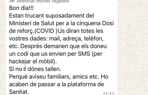 L’alerta s’ha fet, també, per xarxes socials. I ha arribat tant de particulars com de la mateixa policia, que ha fet un avís. En el missatge, segons s’explica, s’indica que des del ministeri de Salut s’ofereix una nova dosi de la vacuna contra la Covid-19. I per poder optar-hi, es demanen dades personals com ara correu electrònic, telèfon o adreça.