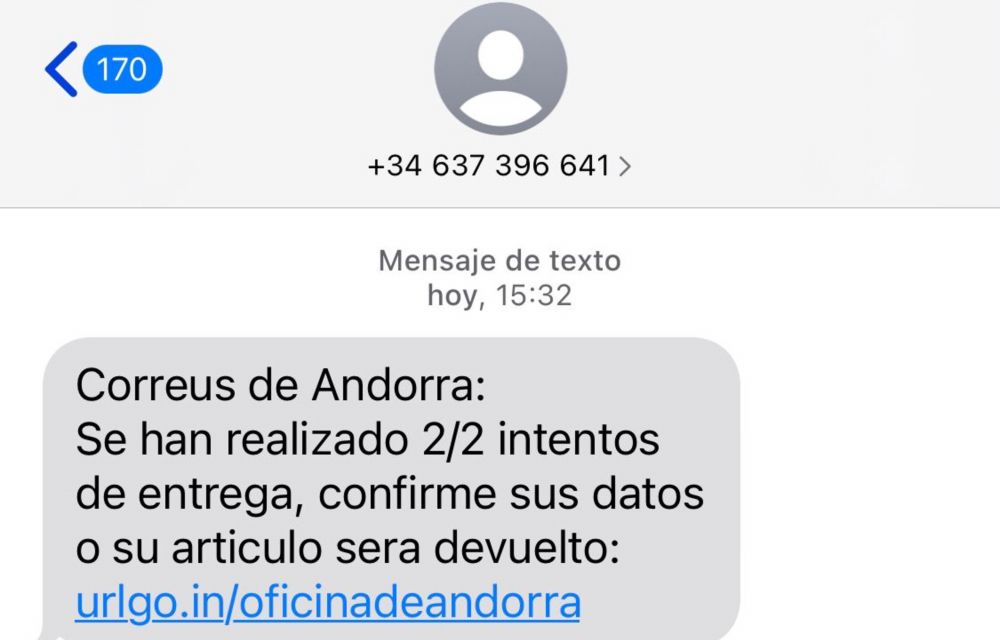 El segon cas que s’ha detectat en les darreres hores afecta al servei postal. Tal com ha comunicat l’Agència Nacional de Ciberseguretat, pot arribar un missatge de “Correus Espanyols” informant que s’han fet dos intents d’entrega d’un paquet i que si no es confirmen les dades l’article serà retornat. Altres usuaris han rebut el mateix missatge identificant-se com a “Correus de Andorra”.