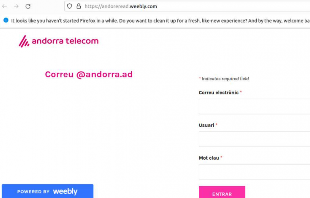 La companyia ha posat en coneixement dels usuaris que el portal web del correu andorra.ad està patint aquest matí un atac de ‘phishing’. En aquest sentit, exposa que “estem a l’espera que donin de baixa la pàgina fraudulenta, així com el seu accés a través de navegadors”.