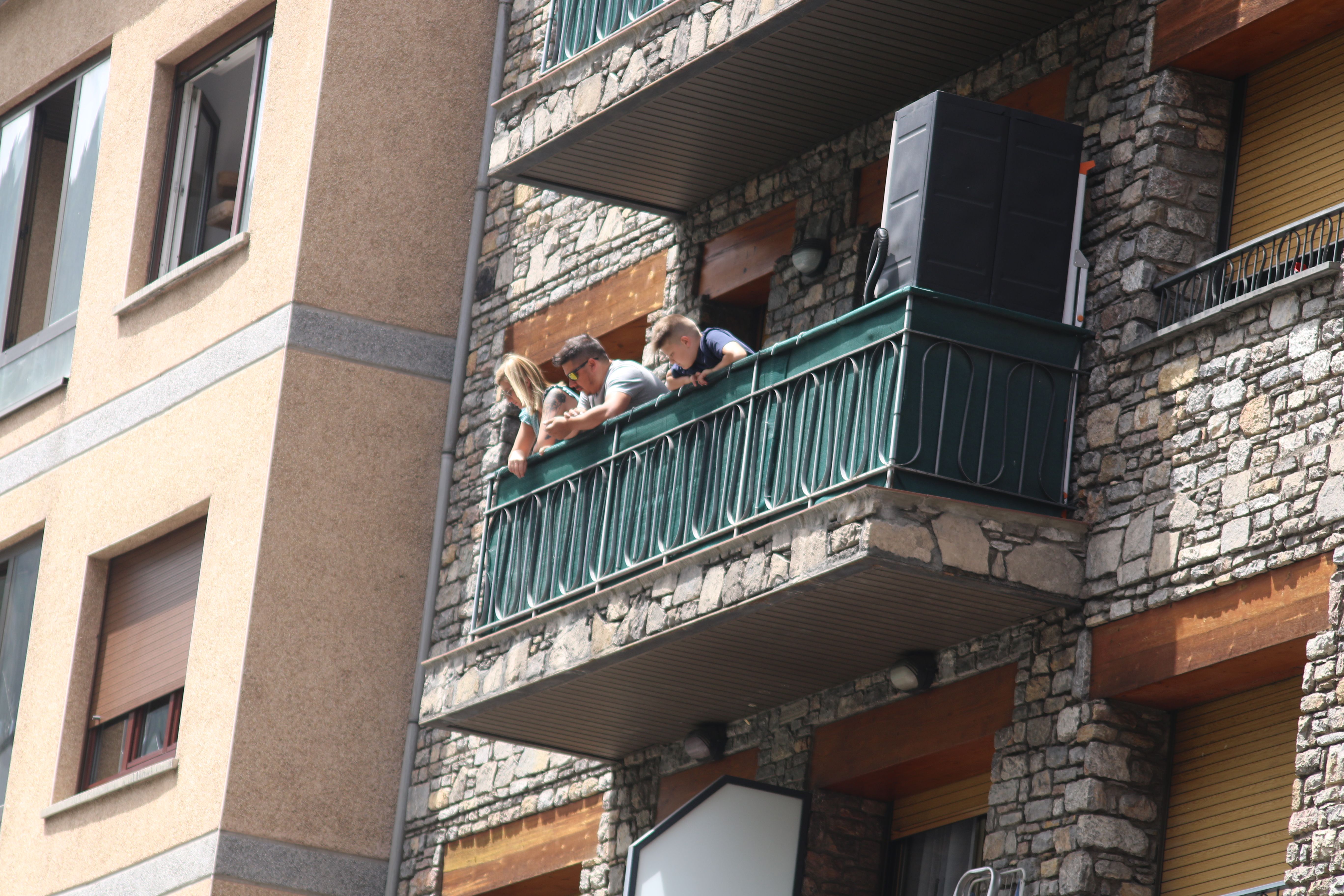 Un dels ocupants d'un dels immobles afectats observant per la finestra.