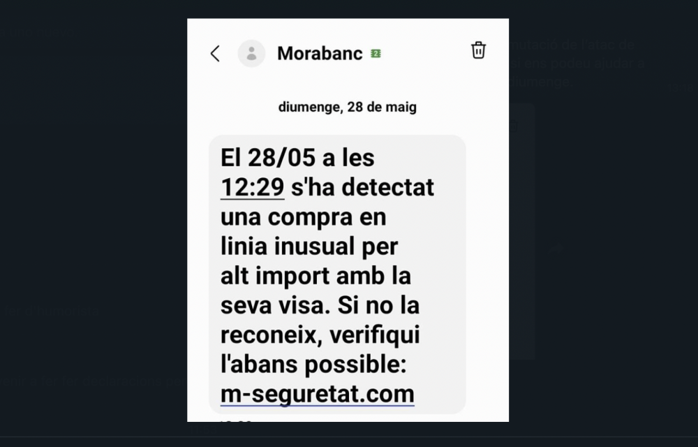 En efecte, els bancs no demanen mai per SMS fer segons quins tipus d’operacions. Per tant, desconfiï ara per ara de qualsevol missatge que li arribi i, així, abans de fer res demani a experts, a la policia o a la seva entitat de crèdit per no veure’s caient en el parany. MoraBanc ha reconegut que té gent de més aquest cap de setmana llarg per mirar de verificar operacions i intentar fer retroaccions quan es descobreix que hi ha hagut un accés il·lícit amb una transferència inclosa.