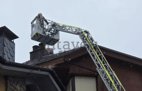 (AMB VÍDEO) Dues dotacions dels bombers descarten que hi hagi res incendiat després d’examinar l’immoble i la xemeneia amb el camió escala en el que ha estat un avís per fum