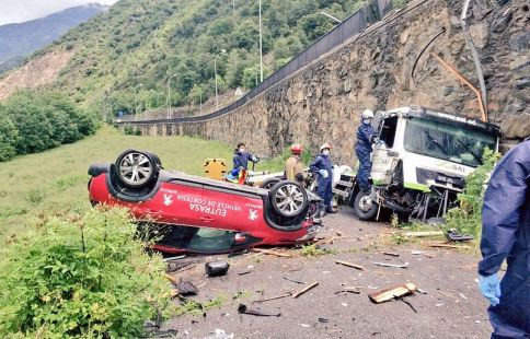 El mur pot fer ben bé set o vuit metres d’altura. El camió grua, d’una empresa andorrana especialitzada en aquest sector, ha trencat la tanca metàl·lica i ha saltat daltabaix del mur amb el cotxe de color bordeus carregat. L’accident ha revelat que el turisme que va ser perseguit dilluns des de la frontera del riu Runer fins al túnel d’Envalira, on va ser interceptat després de llançar-li unes punxes metàl·liques, és un vehicle de cortesia d’un concessionari Peugeot de les Franqueses del Vallès, entre Terrassa i Granollers.