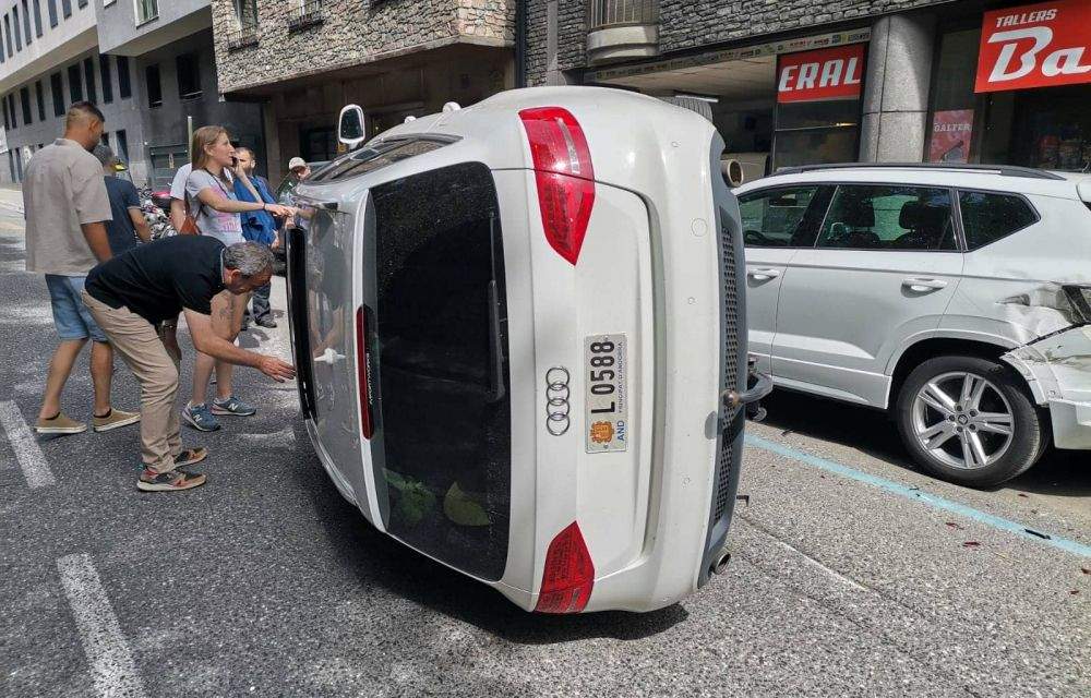 L’accident va passar ahir poc després de 2/4 de 5 de la tarda pocs metres després, en sentit centre d’Andorra la Vella, d’haver passat la rotonda que porta cap al carrer Gil Torres, just on hi havia hagut un atropellament mortal 24 hores abans. El conductor de l’Audi A4, després de col·lidir contra un BMW X3 i un Seat Ateca, va acabar regirat amb les rodes panxa enlaire. L’home va quedar atrapat sense perdre la consciència en cap moment.