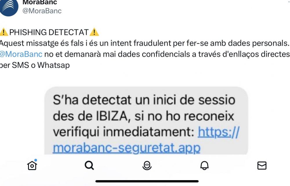 Per tant, davant el dubte, si rep qualsevol SMS o trucada de MoraBanc deixi-ho córrer. En el 99% dels casos es tractarà d’un intent d’estafa que només pot ser que s’acabi consumant si vostè bada. Els diran que hi ha no sé què des d’Eivissa o des d’Alemanya. Els arribaran fins i tot a trucar si escau. I ho faran des d’un telèfon amb una numeració igual o molt similar a la de MoraBanc. Els parlaran en un correcte català. Res, oblidin-se. Perquè si cauen en temptació els aixecaran la camisa, els calés i les dades bancàries.
