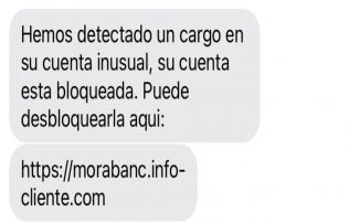 Alguns clients de MoraBanc han rebut missatges de text al seu telèfon mòbil asseverant-los que s’havia detectat un càrrec inusual i que el seu compte està bloquejat. Per desbloquejar-lo es demana que cliquin en un enllaç. Des del banc s’ha alertat que aquest missatge no és una comunicació oficial i es demana esborrar-lo, tenint en compte que és un intent de phising amb l’objectiu d’aconseguir dades personals o contrasenyes per part dels ciberdelinqüents. En el cas que s’hagi accedit, cal posar-se en contacte amb el gestor.