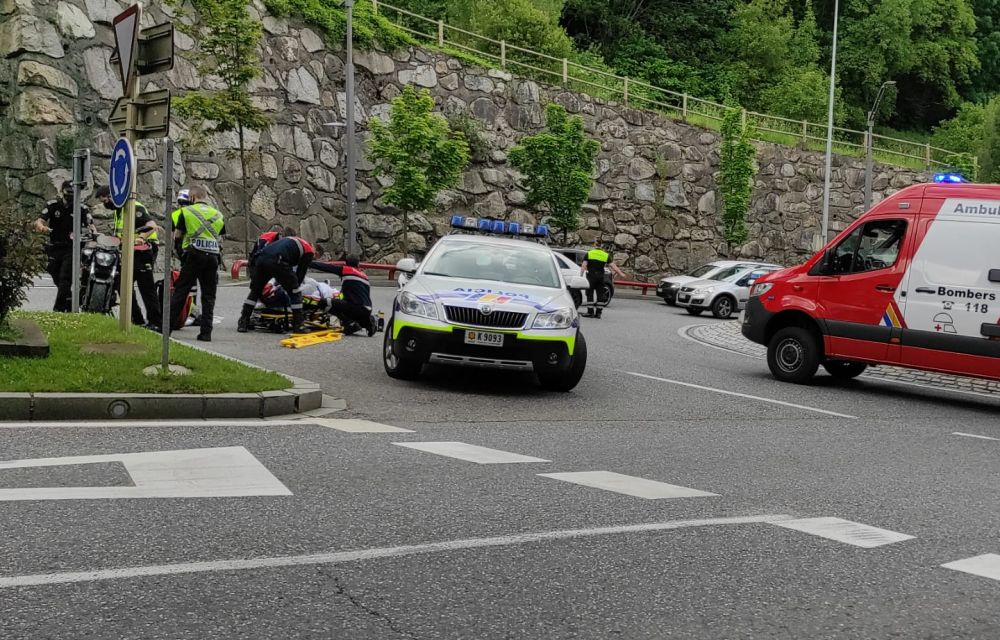 L’accident ha passat poc abans de 2/4 de 6 de la tarda per causes que els agents del grup d’atestats de la policia hauran de dirimir i han causat ferides, essencialment contusions que no revestien gravetat, a un pilot de la moto, un jove resident de 26 anys. L’altre implicat també era del Principat. Fins al lloc de la topada hi han acudit a banda de la furgoneta del grup d’atestats, una patrulla policia, agents del servei de circulació i bombers sanitaris amb l’ambulància.