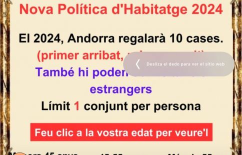 De fet, l’estafa es promociona amb més d’una imatge i amb missatges diferents. En una segona publicació es detalla que la promoció començarà a partir d’aquest mes de maig i que el Govern facilitarà 10.000 apartaments gratuïts als residents d’entre 40 i 75 anys, inclosos els estrangers. Com en el cas anterior, s’especifica que toca només un apartament per persona i també en funció de l’edat s’intenta que l’internauta cliqui per obtenir més informació.