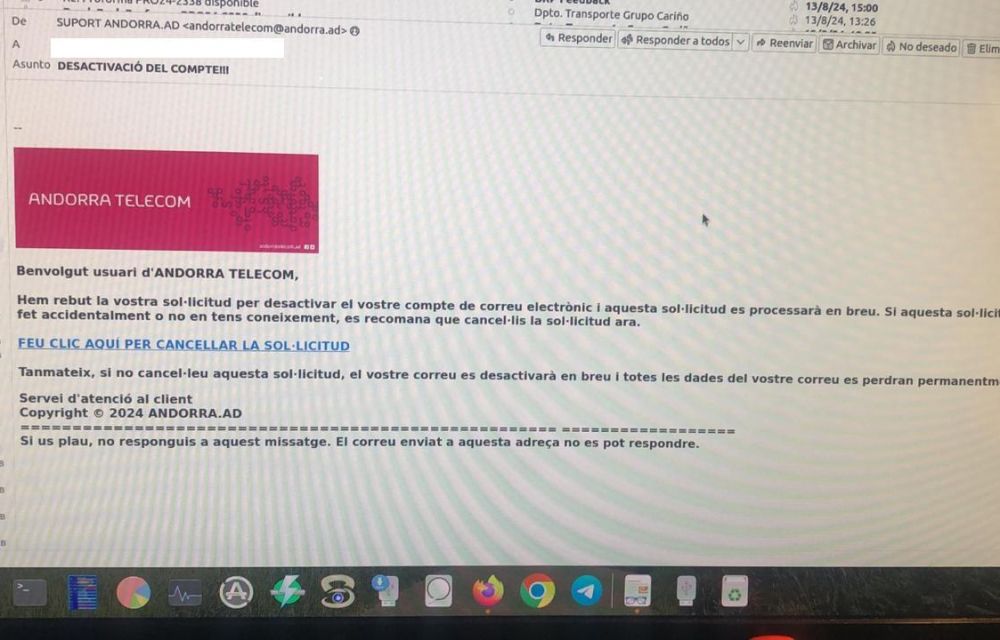 El correu que ha rebut aquesta setmana un dels usuaris d’Andorra Telecom fa referència a una teòrica sol·licitud que hauria fet el client per desactivar el seu compte de correu electrònic. Dins el text s’adverteix que, en el cas que s’hagi fet accidentalment o no es tingui coneixement dels fets, es ‘recomana’ clicar sobre un enllaç immediatament. En cas contrari, el correu “es desactivarà en breu i totes les dades es perdran permanentment”.