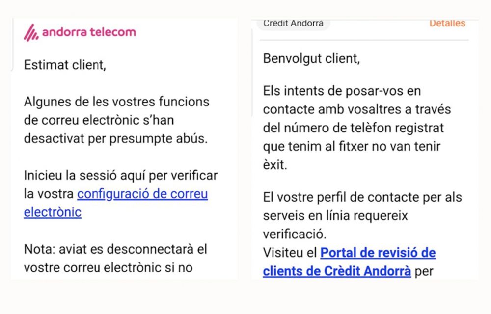 En el cas del correu que es feia passar per Andorra Telecom, s’avisava el suposat client que les funcions de correu electrònic s’havien desactivat i que per verificar que tot era correcte calia facilitar un seguit de dades per reconfigurar el compte electrònic. Quant a Crèdit Andorrà, s’informava el receptor del correu electrònic que els intents de posar-se en contacte per part de l’entitat bancària per telèfon era impossible. Davant d’aquest fet, també es demana verificar les dades i també s’envia cap a un enllaç.