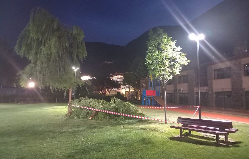 Però la pluja que poc després ha començat a caure amb intensitat s’ha encarregat d’extingir fins i tot les brases. Els bombers només hi podien arribar amb helicòpter i la forta pluja els ho ha impedit. De fet, l’helicòpter fins i tot ha tingut dificultats i impediments per aterrar per altres motius a l’helistop de l’hospital atès les fortes ràfegues de vent que s’han donat al centre del país, on els bombers han hagut d’actuar (al Parc Central i a la Comella) per retirar branques que han caigut posant en perill els usuaris de l’espai públic.