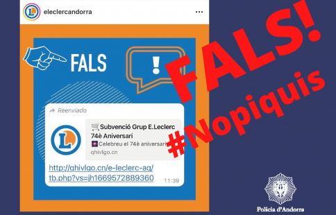 La web és senzilla, planteja un formulari mitjançant el qual es pot arribar a obtenir mil euros. La premissa és el suposat 74é aniversari de la cadena de supermercats present a tota Andorra, E.Leclerc. S’ha muntat mitjançant un enllaç que es comparteix des de fa dies als grups i xarxes socials. Però, aquest dimarts, la policia ha alertat que es tracta d’un cas de phishing.
