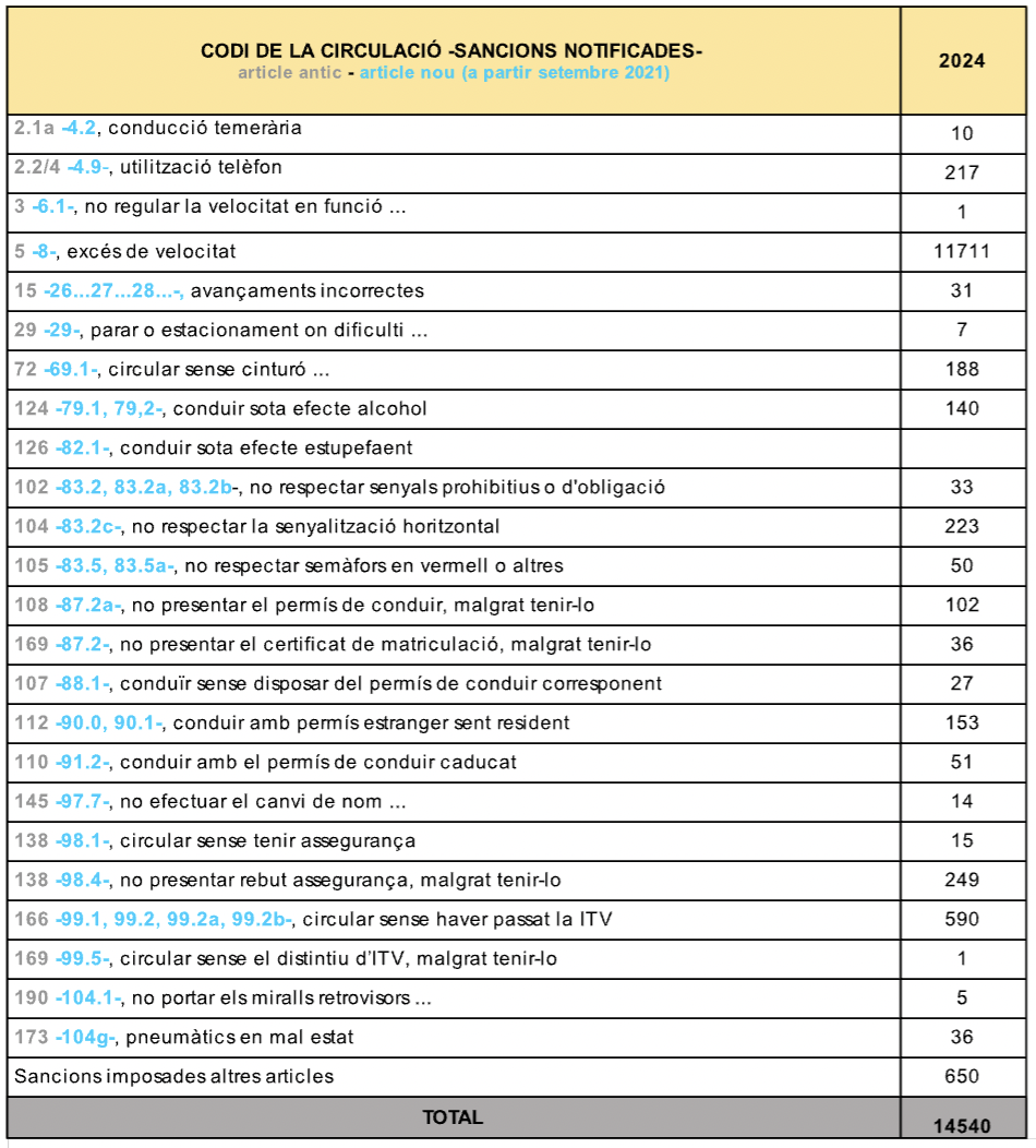 El cos va notificar l’any passat un total de 14.540 sancions, la immensa majoria de les quals procedeixen dels radars i, per tant, es multa infraccions en relació amb la velocitat. Més enllà d’aquestes, els principals incompliments que porten la policia a sancionar és el fet de circular sense haver passat la corresponent ITV (590) o no dur el rebut de l’assegurança pertinent (249). No respectar la senyalització vertical (223) o conduir usant el telèfon (217) també són conductes força reprotxables.