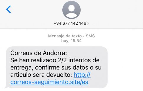 Efectivament, durant tota la jornada d’aquest dilluns desenes de telèfons andorrans estan rebent missatges de text procedents d’un telèfon mòbil espanyol pels quals, suposadament, farien falta unes dades per poder acabar de completar alguna tramesa postal. Clicant l’enllaç que s’annexa en l’SMS l’únic que aconseguirà és que, en certa manera, agafin el control del mòbil per mirar d’obtenir algunes de les seves dades.