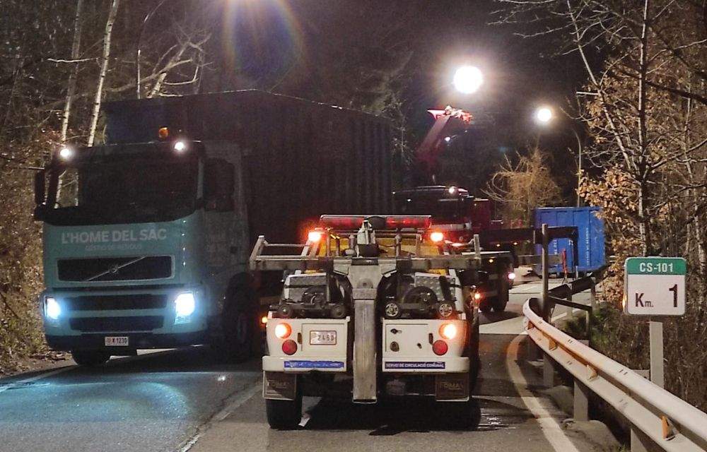 Això ha obligat a tallar la circulació a la zona, just al costat de l’accés al centre esportiu dels Serradells. Per accedir a les urbanitzacions de més amunt, cal arribar-hi des d’Escaldes. Les fonts consultades apunten que la situació es pot allargar durat una bona estona, ja que ara s’està intentant rescatar i tornar a pujar a la carretera la màquina. No sembla, però, una tasca senzilla. S’està intentant amb una grua que acompanyava el comboi però no està clar que la maniobra no requereixi un vehicle més potent.