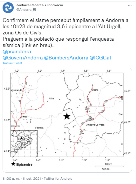 Andorra Recerca i Innovació ha activat l'enquesta ciutadana per recollir les valoracions de la població sobre com ha percebut aquest moviment sísmic. No poden predir si hi haurà rèpliques, però, en cas que es produeixin, seran de menys intensitat i en un radi més petit.