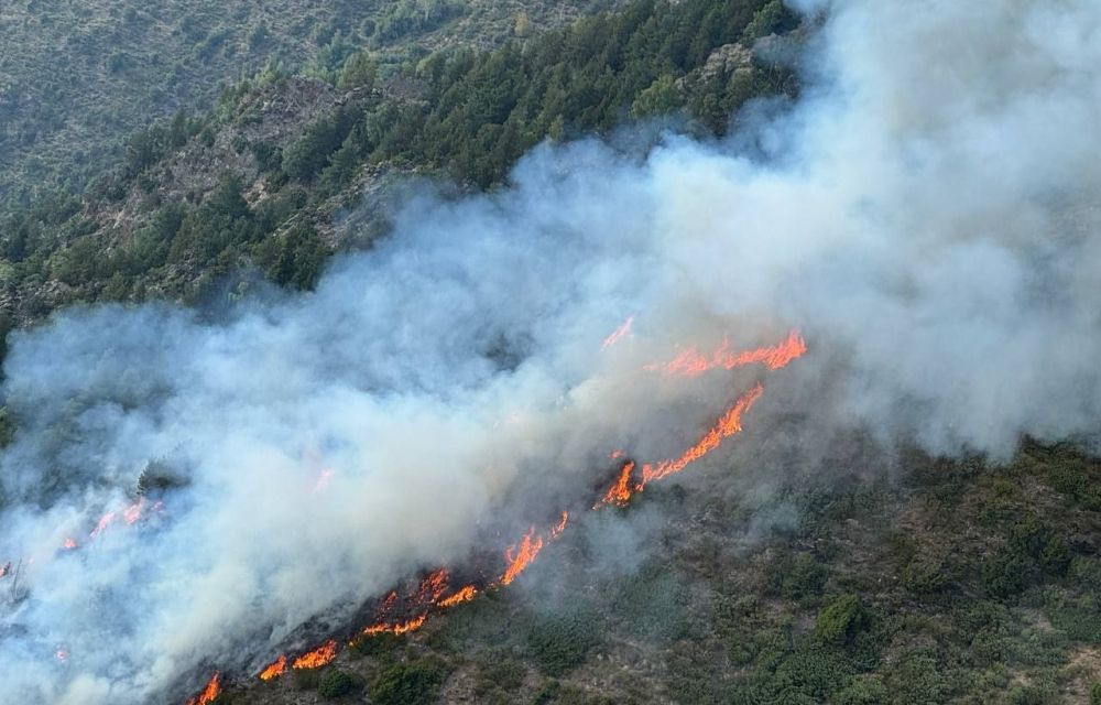 📹 Més imatges aèries de l'incendi, en zona boscosa, a Alins. El foc avança per la vessant cap a la cresta.#bomberscat #MAER #GRAF #EPAF pic.twitter.com/ydasKjKucd