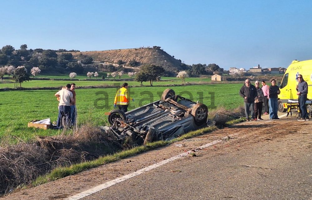 Arran de la topada, en una recta a l’altura del quilòmetre 16,10 de l’esmentada carretera, al terme municipal de Guissona, un dels vehicles implicats ha sortit de la via i acabat completament bolcat en un terreny agrícola a tocar de la calçada. En principi, els ocupants dels dos vehicles han pogut sortir de l’interior dels mateixos pel seu propi peu encara que almenys una de les persones que viatjaven en el turisme bolcat es queixava molt i s’ha mantingut estirat en el camp en espera de l’arribada de les emergències sanitàries.