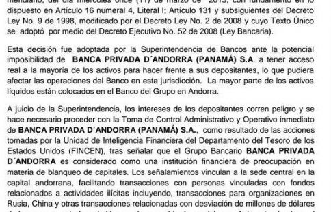 La Superintendencia de Bancos de Panamá informó esta tarde que tomó el "Control Administrativo y Operativo" de la oficina local de Banca Privada de Andorra (BPA), un día después que el Departamento del Tesoro de Estados Unidos acusara a la filial principal de este banco "de estar involucrada en el lavado de dinero internacional y vinculada a organizaciones criminales rusas y operaciones de creación de empresas pantalla para canalizar fondos de la petrolera estatal venezolana PDVSA".
