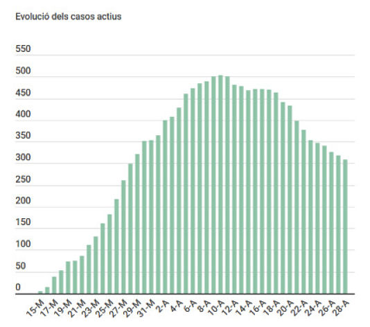 A més d’un alentiment clar de l’expansió de la Covid-19, també altres dades deixen clar que l’evolució no és dolenta. La primera, el nombre de curats, que ja són 398. La segona, els pacients encara malalts, els casos actius, que han tornat a davallar fins als 309. Es mantenen els positius detectats entre els professionals sanitaris, 49, i els cossos especials, 5.