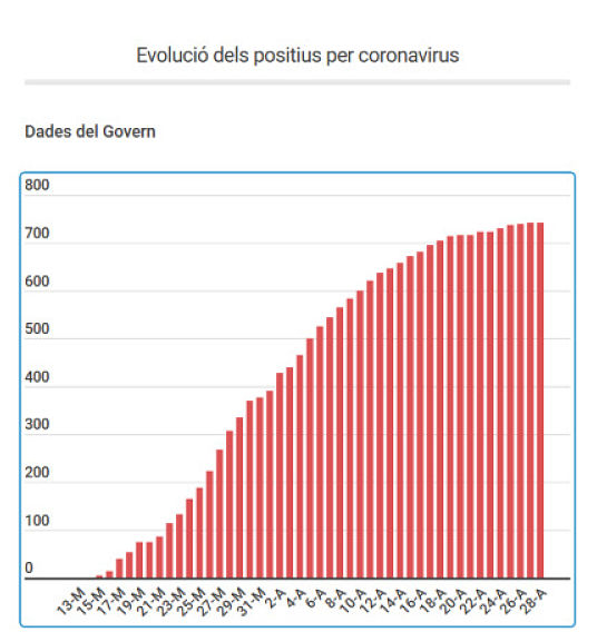 El balanç de l’epidèmia del coronavirus s’ha saldat, per tercera vegada en els darrers dies, amb cap nou positiu més. Per tant, continuen sent 743 les persones que han estat contagiades amb la Covid-19 des de l’inici de la crisi sanitària. Una jornada més segueix incrementant-se el nombre de curats, que ja freguen els 400, i davallant el nombre de pacients actius, a punt de baixar dels 300. La mala notícia és la confirmació de la víctima mortal número 41, ja avançada dilluns a la nit per Altaveu.