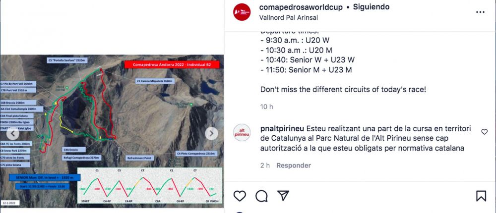 La denúncia s’ha fet d’una forma relativament informal, però vista la transcendència i seguiment de la prova, i com de calent està l’ambient, les diferències territorials, qualsevol veu que s’alci ja és prou notable. I els responsables del parc han posat per escrit, en un comentari en un dels posts que l’organització del campionat mundial al tomb del Comapedrosa, un dels primers de la jornada d’aquest dissabte, el seu malestar. En concret, des del compte oficial del Parc Natural de l’Alt Pirineu s’ha denunciat que “esteu realitzant una part de la cursa en territori de Catalunya” i que es realitza, s’ha dit, “sense cap autorització a la que esteu obligats per normativa andorrana”.
