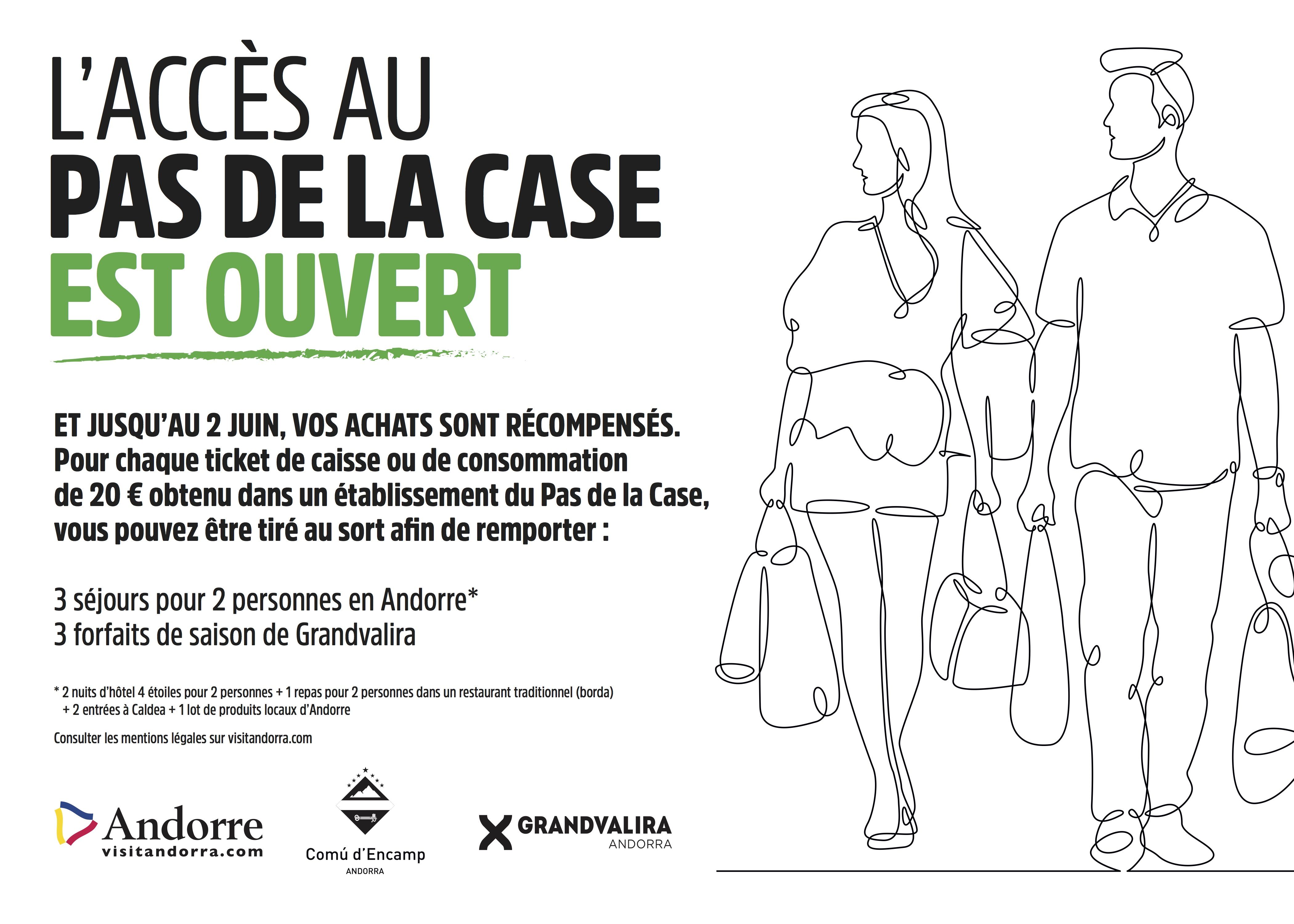 Sota el lema ‘L'accès au Pas de la Case est ouvert’ la campanya de comunicació, que s’iniciarà el mateix divendres, pretén informar als visitants que la carretera que connecta amb França torna a estar oberta en els dos sentits de la marxa. La campanya la impulsa Andorra Turisme amb la col·laboració del comú d’Encamp i Grandvalira. Coincidint amb la reobertura de la circulació, tots aquells turistes que realitzin compres superiors a 20 euros podran entrar en un sorteig de tres estades al país i tres forfets de temporada de Grandvalira.