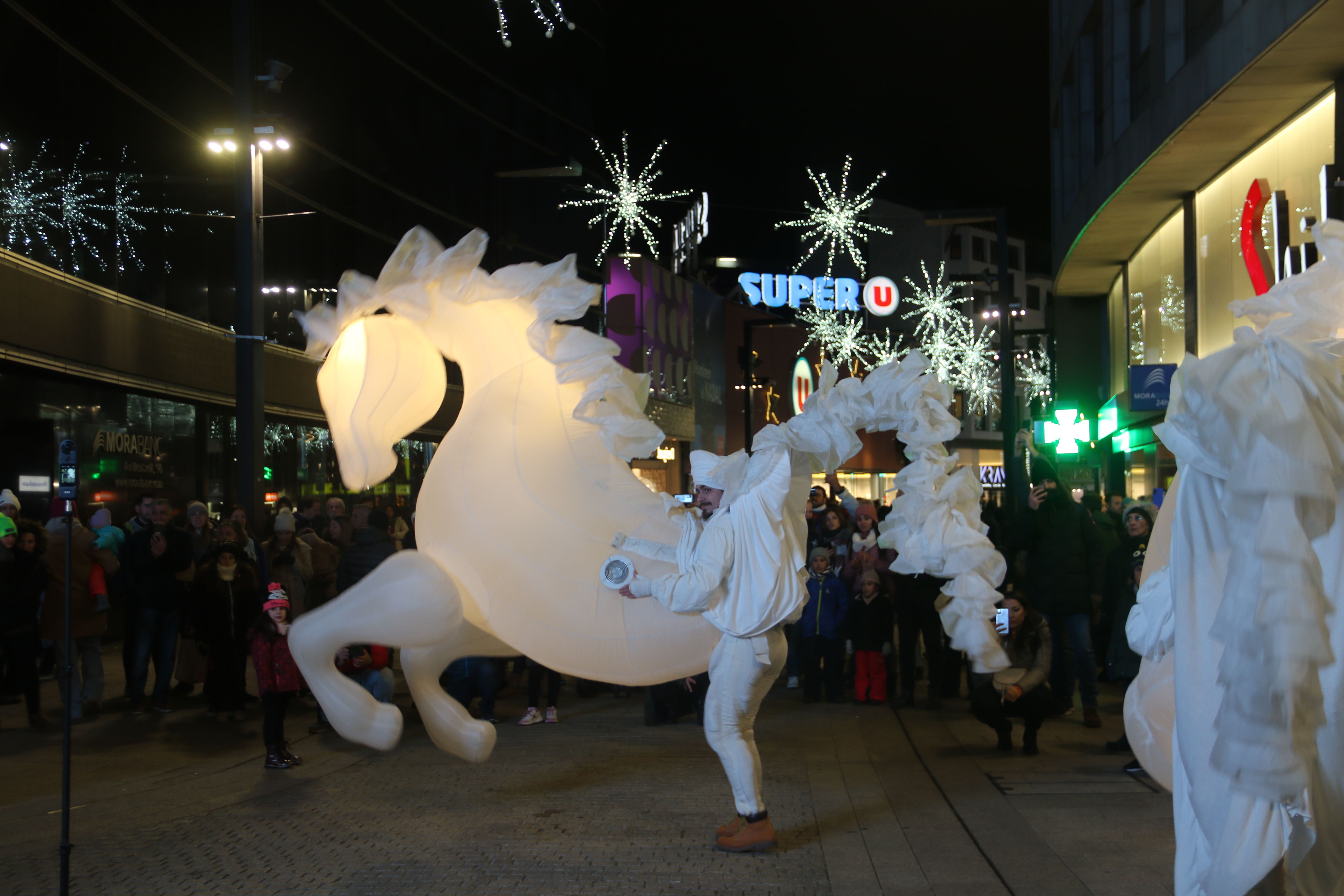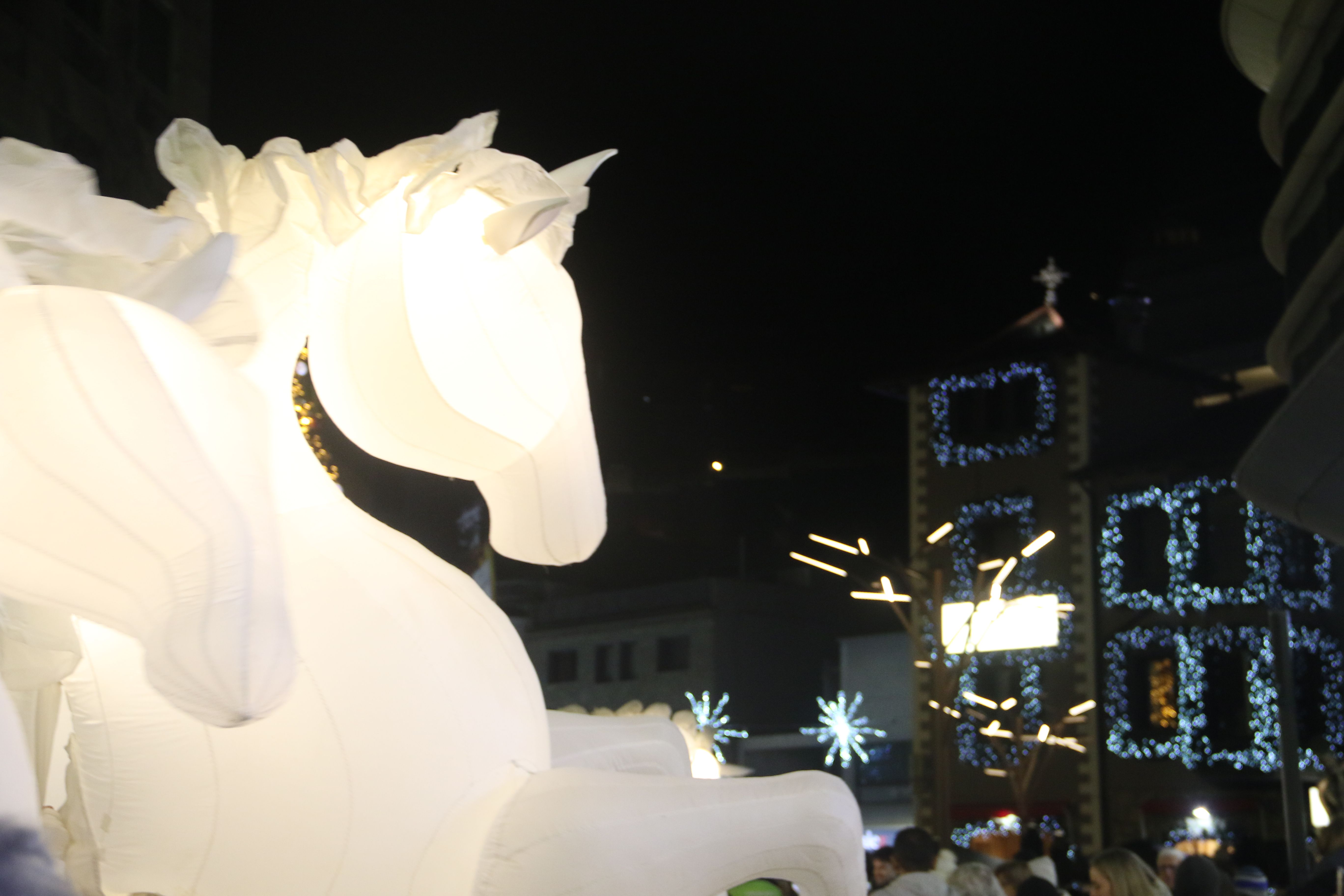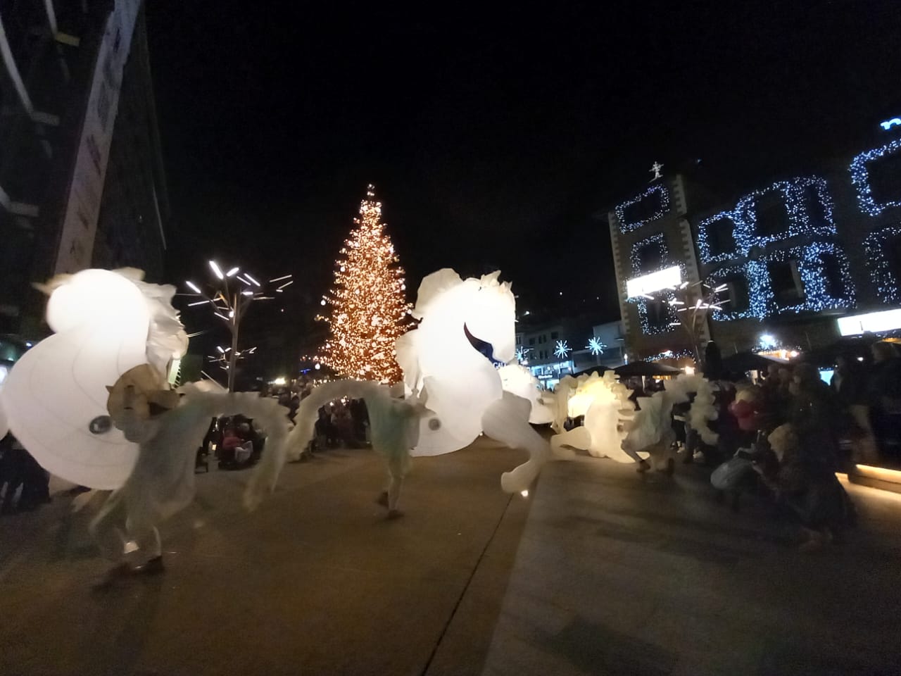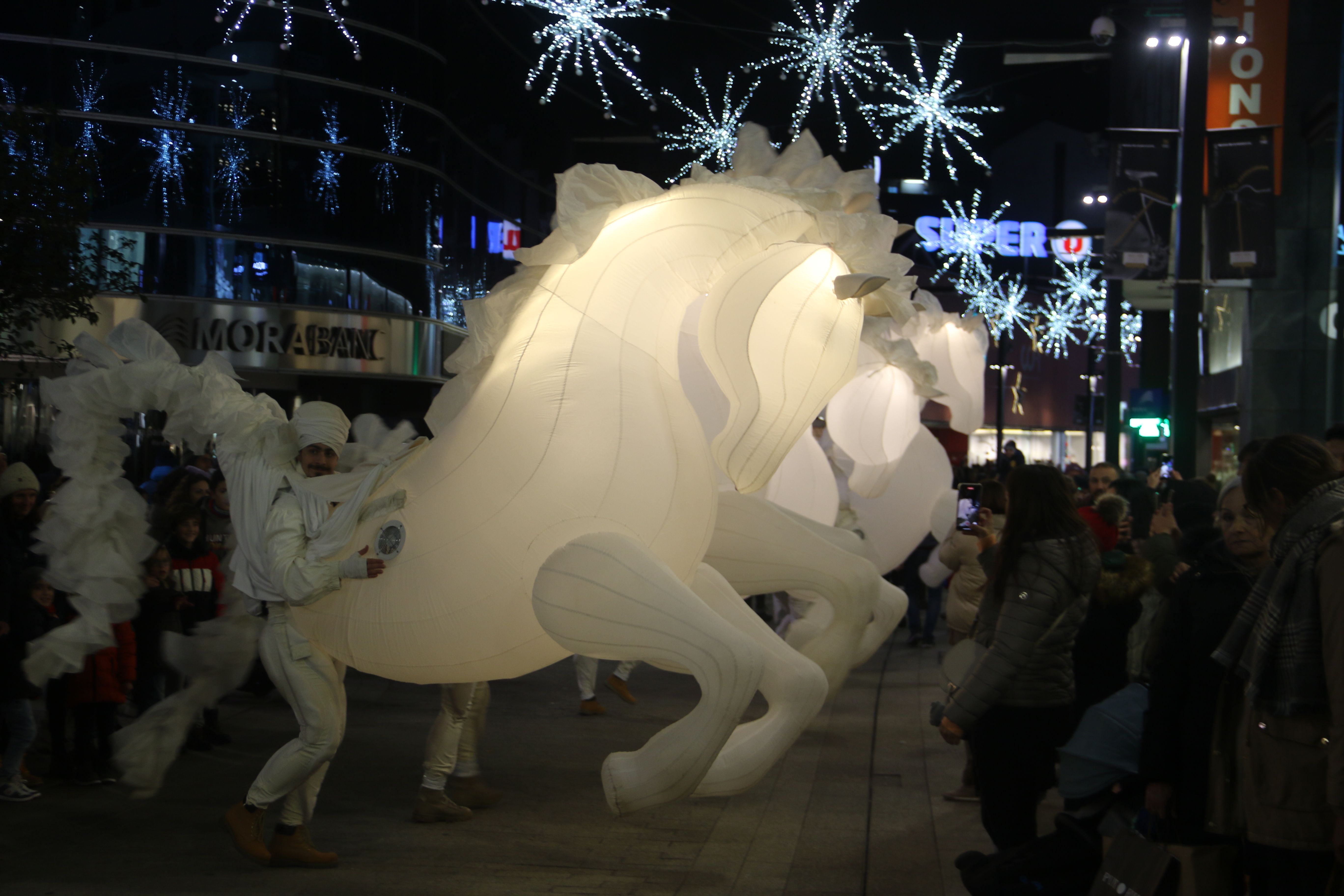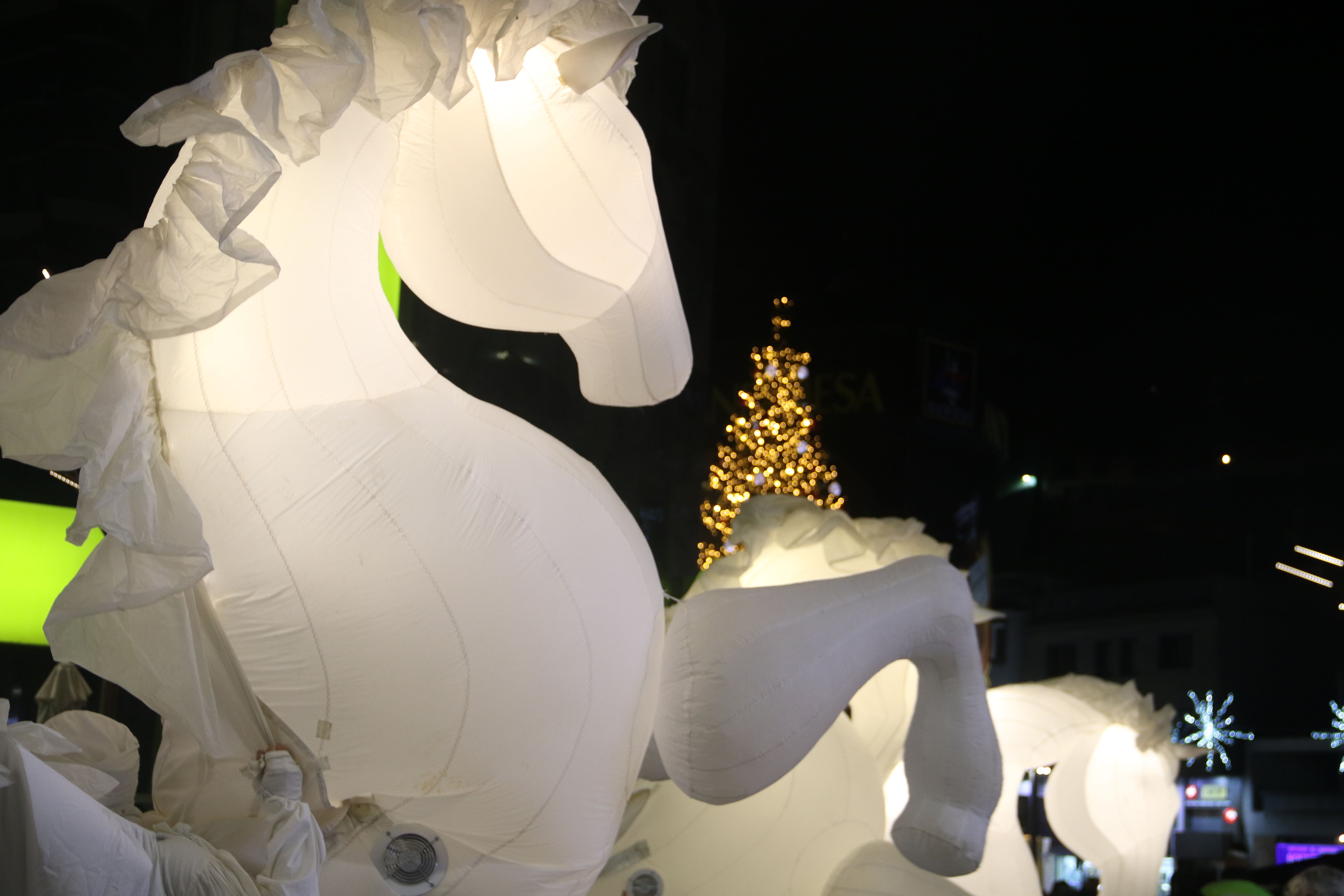 Del carrer de la Unió fins al mercat nadalenc de la Plaça del Poble, amb algunes aturades per fer les delícies del públic cada X metres. Ja sigui a la mal anomenada plaça del ‘The Cloud’ o a la plaça de la Rotonda. O a mitja pujada de la part alta de l’avinguda. Ara s’enlairen els cavalls ara s’ajeuen. Ara s’ajunten de dos en dos, ara troten les cinc figures enganxades. “Són poquets”, deia una senyora advertint de l’espectacularitat que suposaria poder veure cavalcar més ‘chevals’ entre la multitud.