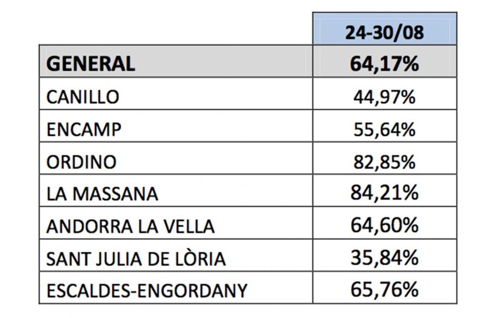 Així, la freqüentació a Ordino va arribar al 82,85% mentre que a la Massana es va ‘disparar’ fins al 84,21%. Només a les parròquies centrals es va seguir una mica el ritme, situant-se en percentatge que són els que han acabat sent la mitjana general. L’ocupació mitjana registrada a Andorra la Vella va ser del 64,60% mentre que a Escaldes va arribar fins al 65,76%. A la resta de parròquies l’ocupació va ser molt més baixa.