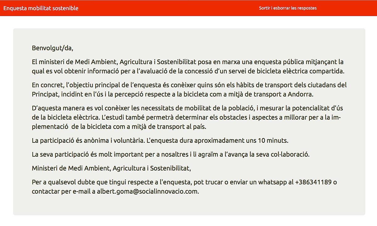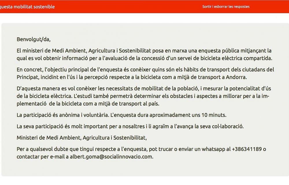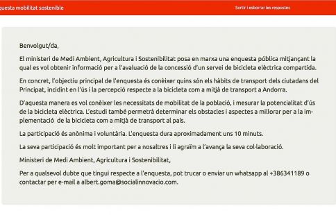 El Govern, d’acord també amb l’Automòbil Club d’Andorra (ACA), va anunciar el setembre la ferma voluntat de treure en concessió durant aquest 2017 un servei de bicicleta elèctrica similar, per exemple, al Bicing de Barcelona. De fet, justament si es coneix aquest servei o el Vélib de París és una de les preguntes que es formula. L’enquesta és virtual i anònima. I consta de diverses pantalles que recullen tant dades personals de qui respon (edat, estat civil, lloc i anys de residència al país, nacionalitat, membres que composen la llar familiar…) com hàbits de mobilitat.