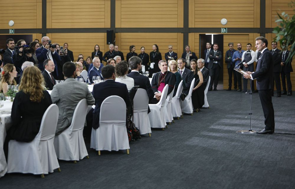 Un moment del discurs de Macron durant el sopar que ha ofert a la societat andorrana.