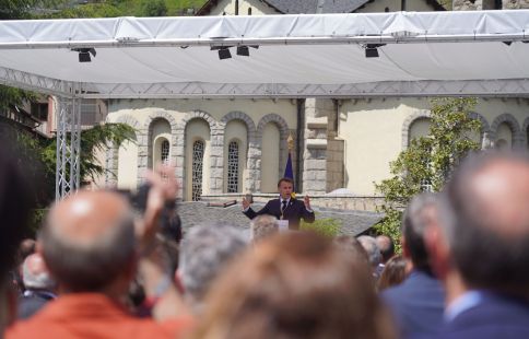 Set anys després de la seva darrera visita, Macron ha obert el discurs amb una evocació emocional del retrobament amb el poble andorrà, destacant que aquest temps “m’ha semblat llarg” i subratllant el valor simbòlic de tornar a trepitjar la plaça del Poble. En aquest inici més distès, també ha lamentat no haver pogut visitar totes les parròquies: “Tornaré”, ha afirmat entre rialles. Alhora, ha posat en valor la institució dels coprínceps i la seva funció de protecció del país des dels Pariatges.