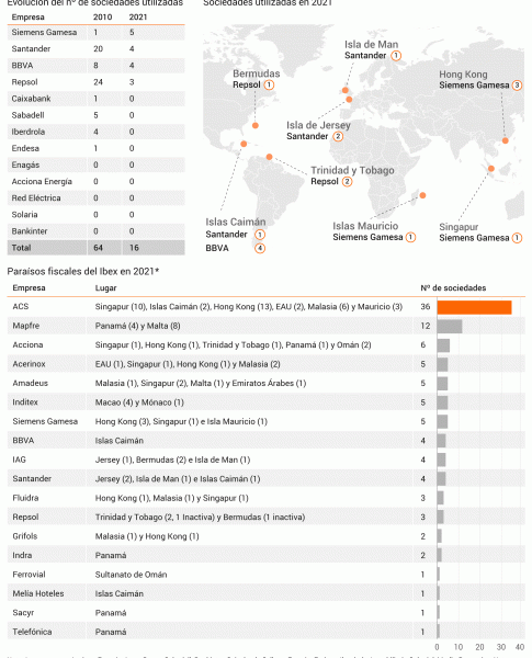 El ranking por número de sociedades en territorios fiscalmente opacos o que tienen la consideración de paraísos fiscales lo lidera actualmente ACS. El grupo que preside Florentino Pérez tiene actualmente un total de 36 sociedades domiciliadas en este tipo de localizaciones. En concreto, cuenta con 13 filiales en Hong Kong, 10 en Singapur, dos en las Islas Caimán, seis en Malasia, tres en Isla Mauricio y otras dos en Emiratos Árabes Unidos, además de distintas sociedades en el Estado norteamericano de Delaware.