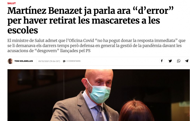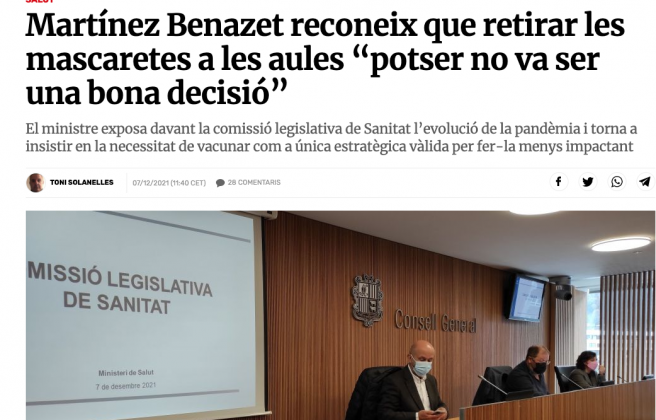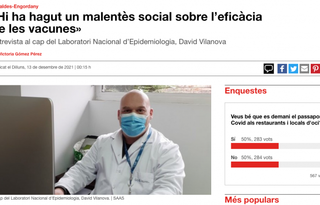 Y para más I.N.R.I. tan solo nos faltaban las declaraciones del Cap del Laboratori Nacional d'Epidemiologia, Dr. David Vilanova, en las que a la pregunta de Victoria Gómez Pérez, " - ¿Hi ha hagut un malentès social sobre l’eficàcia de les vacunes?", la respuesta del galeno ha sido la siguiente: " - Sí, perquè els estudis clínics, que és un concepte molt diferent al dels experiments, que van fer tant Pfizer com Moderna, el que indiquen és que una persona vacunada té menys perill d’acabar a hospitalitzada que una no vacunada. A vegades, per desconeixement, s’han dit coses que científicament no són certes, com que el que faria la vacunació seria reduir la transmissió del virus i acabar amb la pandèmia. La funció d’una vacuna sempre és i serà reduir els símptomes quan una persona s’infecta. Tant de bo que les proves que s’estan fent amb el que es diu vacunes estèrils assoleixin que quan algú s’infecti, no tingui la capacitat de reinfectar-se. Aquest tipus de vacuna existeix i s’hi està treballant, però no és el que tenim ara mateix". A otra pregunta de Victoria, " - ¿Creu que la normalitat tornarà algun dia?", la respuesta del médico ha sido la siguiente, " - Soc optimista i crec que sí, perquè tard o d’hora tots passarem la malaltia, perquè és un virus que es transmet tan ràpidament que és impossible posar-hi fre. I en aquest sentit, millor està vacunat, perquè entre la immunització general i una evolució menys efectiva del virus la situació podrà tornar a la normalitat. Jo sempre he dit que en teníem per dos anys ben bons... Però necessitem que tots els països del món vagin alhora. I això és molt complicat". (Vean link aquí).