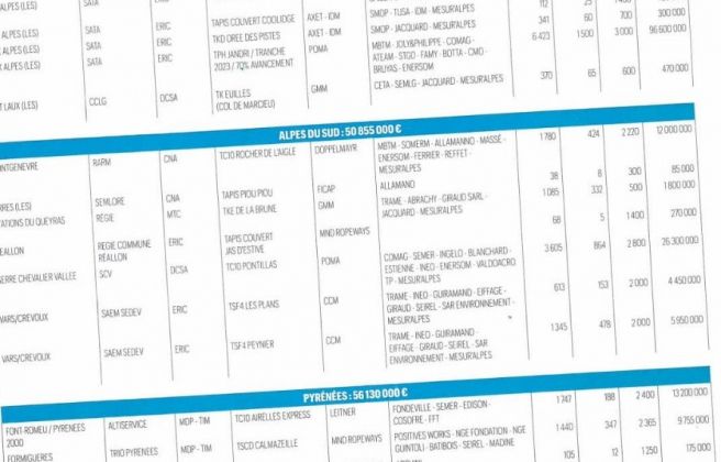 Les dades de 2023, es van publicar al número 300 de la revista bimestral, corresponent al gener-febrer de 2024; són dades desglossades pels diferents conceptes (remuntadors, pistes, neu produïda, equipaments de lleure, ginys trepitja-neu, etc.) i pels massissos muntanyosos de la geografia francesa. La inversió per tot l’hexagone en 2023 va ser de 546 M€, el que representa un 33 % de la xifra bruta de negoci: 1655 M€.