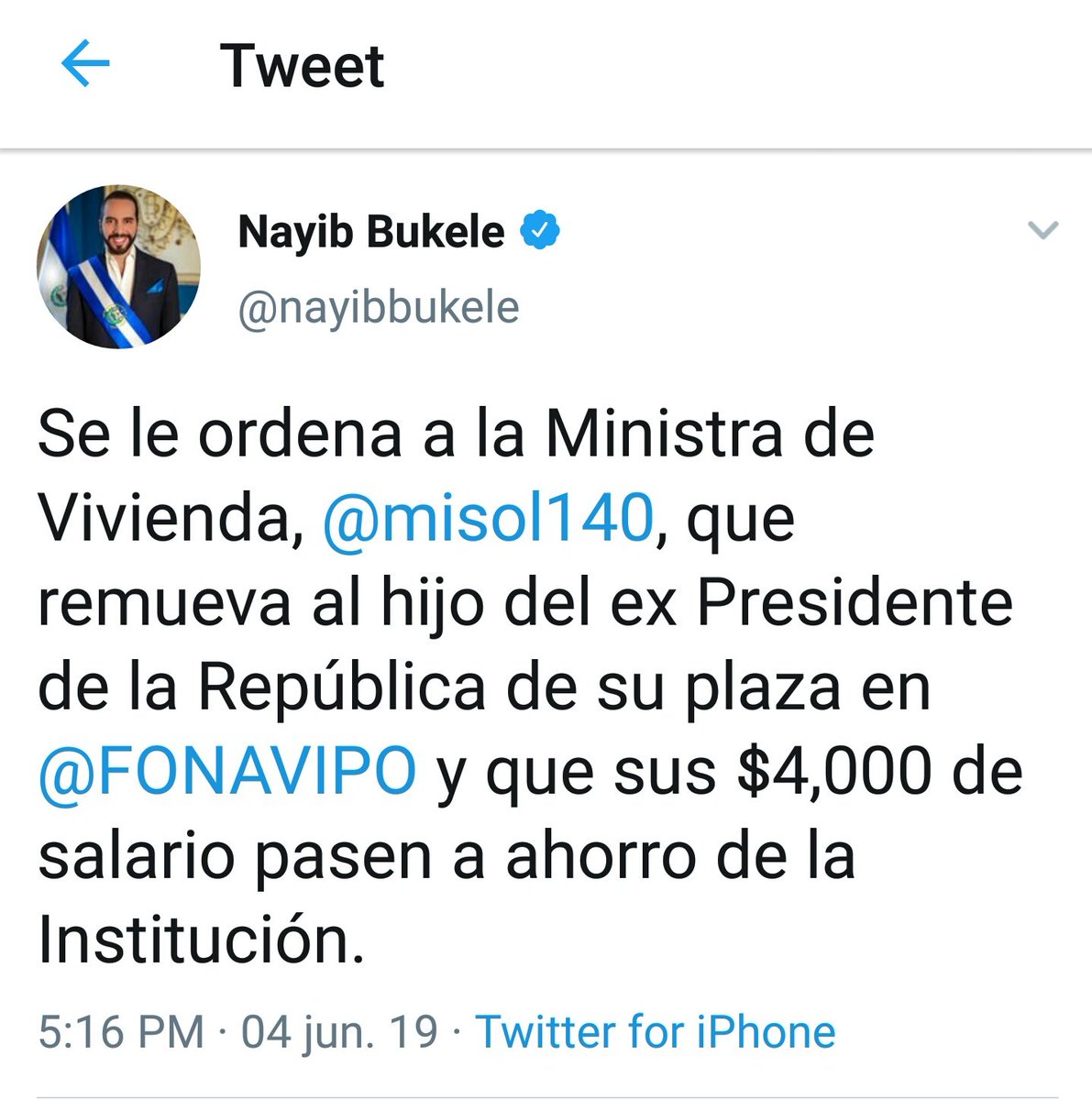 "Se le ordena al Ministro de Seguridad @RogelioRivasSS, remover de su cargo a Antonio Maldonado Sánchez, también nieto del ex Presidente Sánchez Cerén, también de la Dirección de Emisión de Pasaportes. No contrate reemplazo, promueva a alguien dentro de la institución".